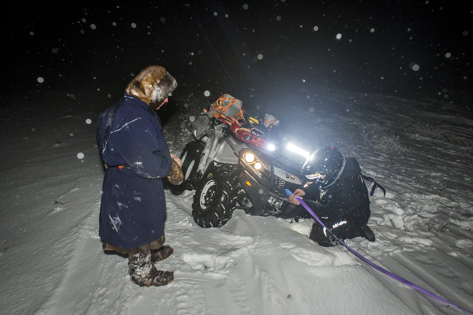 In Shoyna the team had to stay for half a day instead of an hour or two, as it was originally planned. The reason was a breakdown of a quad bike. The variator belt should last for a long time, but when riding on the tracks, the transmission load is much higher than on wheels, so the belts are easily broken. That was the third broken belt for the trip, and the last one of the spare belts remained in Kamenka. The spare belt should have been brought by a passing snowmobile. But still we waited for a long time. Finally we got the spare belt, fixed the quad bike and drived on, as the night was just around the corner.